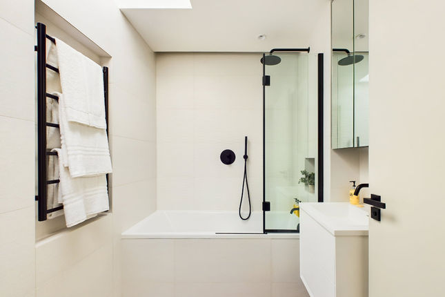 The two bedrooms are each furnished with King-size beds, which can be converted to Twin beds upon request. Both bedrooms have access to a private balcony at the rear of the property, overlooking the tranquil Regent’s Canal. One bedroom includes an ensuite bathroom with a walk-in shower, while the master bathroom boasts a bathtub with elegant marble detailing.
