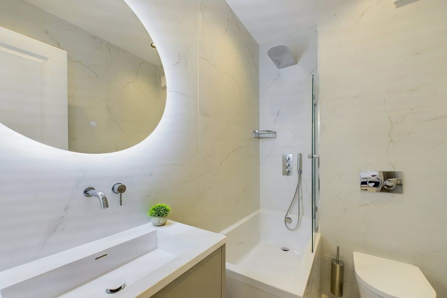 The master bedroom features a king-size bed, generous wardrobe space, and an en-suite bathroom with a walk-in shower and underfloor heating. The second bedroom offers a cosy double bed and wardrobe, while the additional bathroom includes both a bath and shower, also benefiting from underfloor heating.