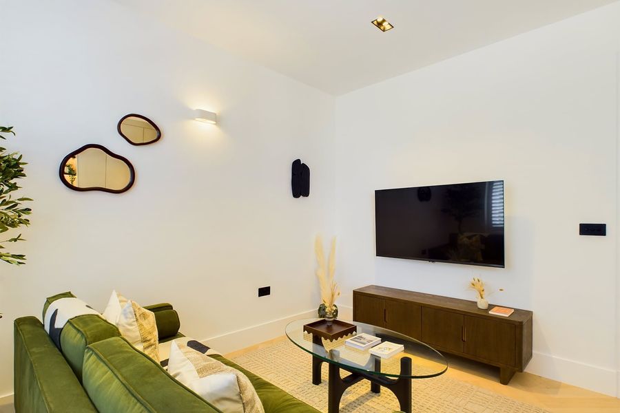 The lounge is furnished with a plush sofa and Smart 4K TV, while the dining area comfortably seats four. The sleek, modern kitchen comes fully equipped with premium appliances, including a Nespresso machine, ensuring a convenient home-from-home experience.