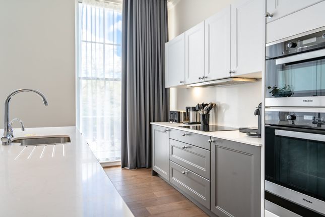 The living area features a comfortable sofa, a cozy reading corner, and a dining table that seats six guests. Glass doors from this space lead into the stunning kitchen designed by Nolte Kuche, complete with a Silestone quartz island and a breakfast bar for additional seating. Adjacent to the kitchen is a guest bathroom. The kitchen is equipped with high-end appliances, including a built-in Miele oven, microwave, induction hob, fully integrated dishwasher, fridge-freezer, and an undercounter wine cooler. There’s also a Miele freestanding tumble dryer and washing machine.